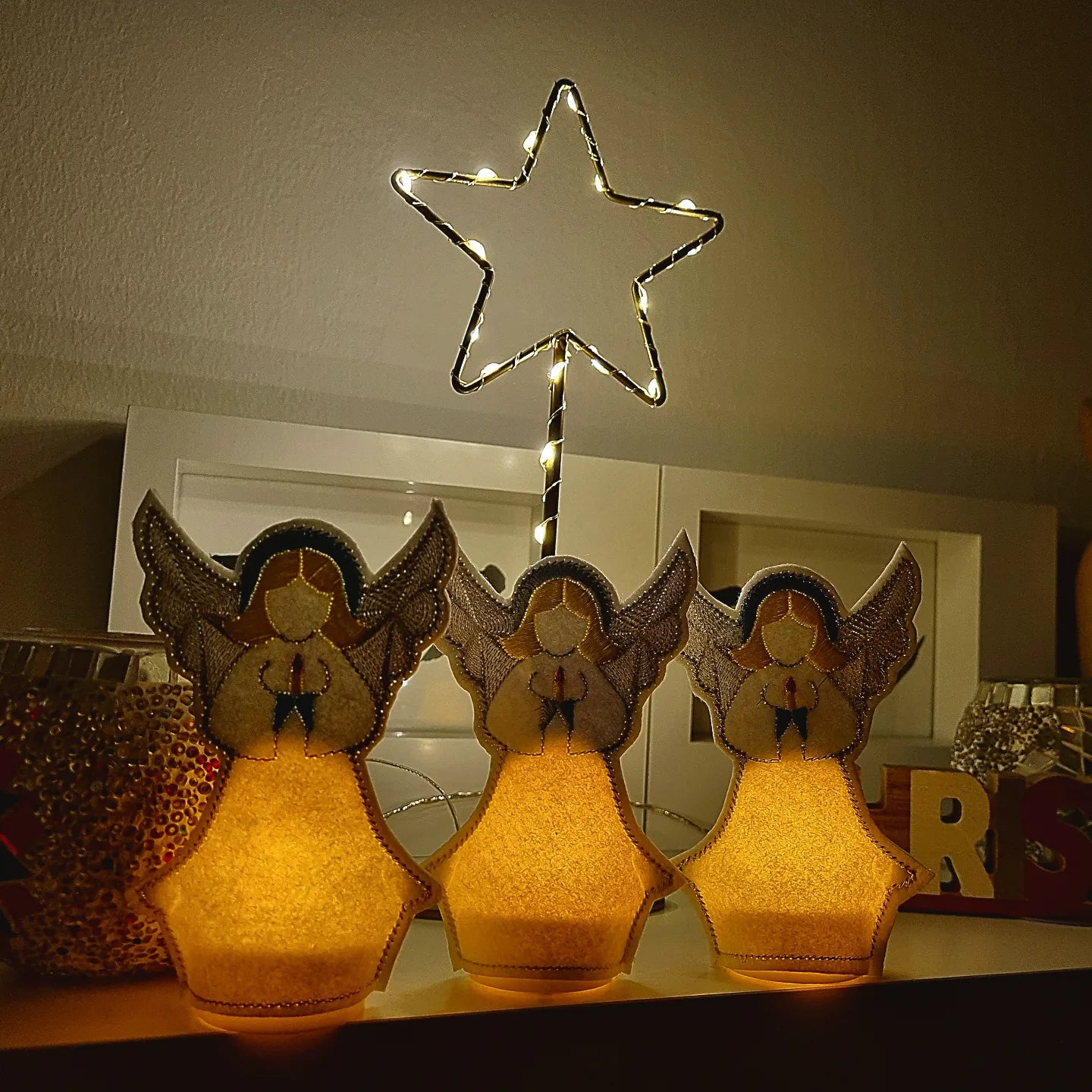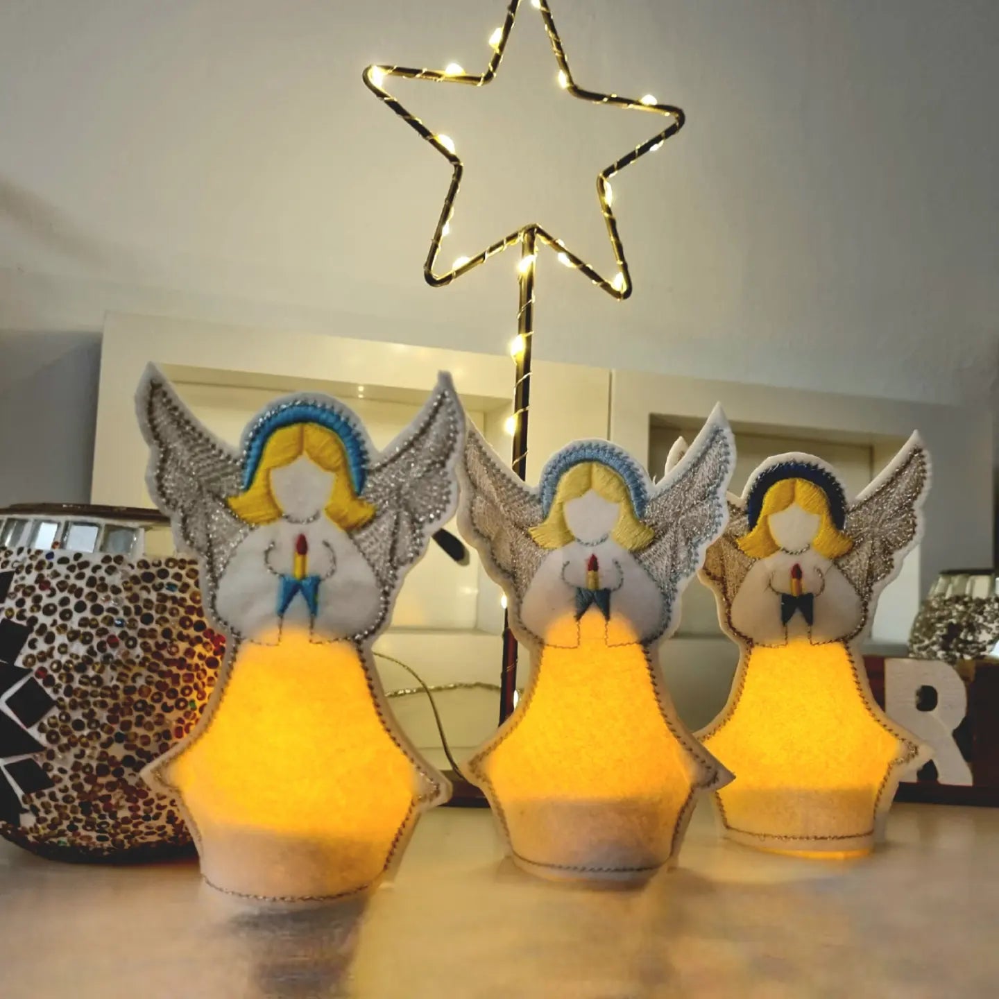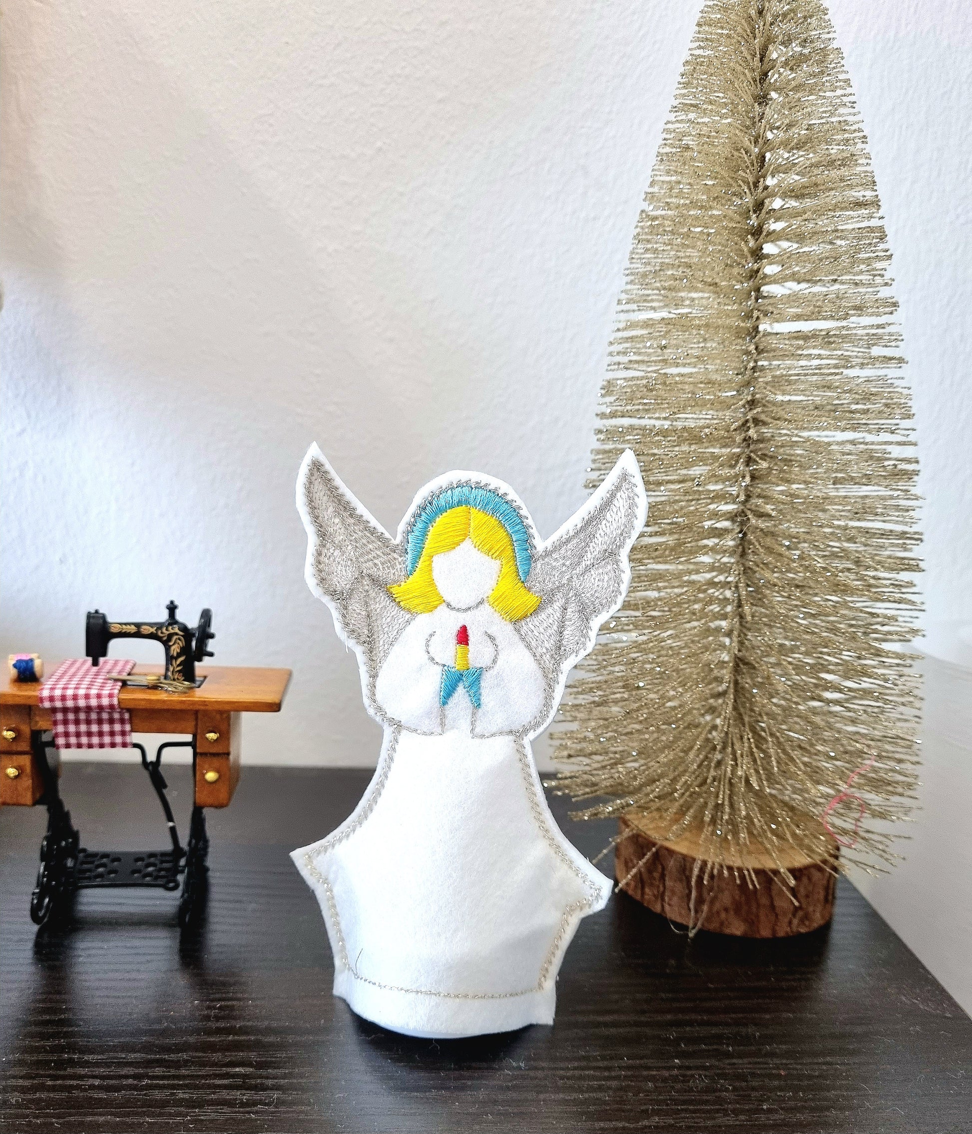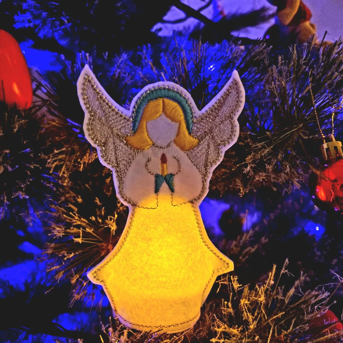 This is a machine embroidery design in the hoop. Figure can cover a small standard LED candle, and when you hang on the tree it will not fall down. It can also use as stand decoration.