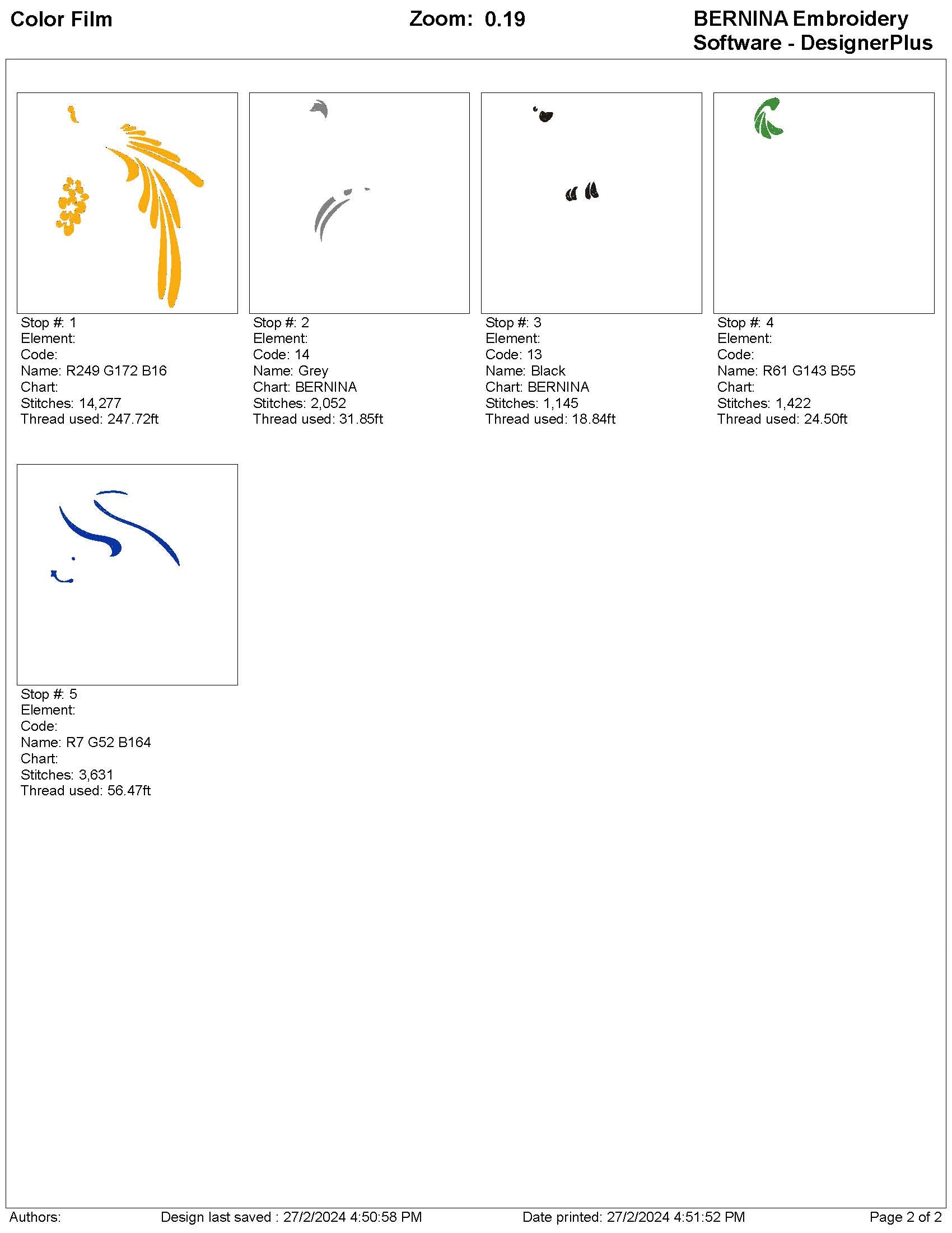 Detailed information about each design, including stitch count and color changes, is provided under the pictures.