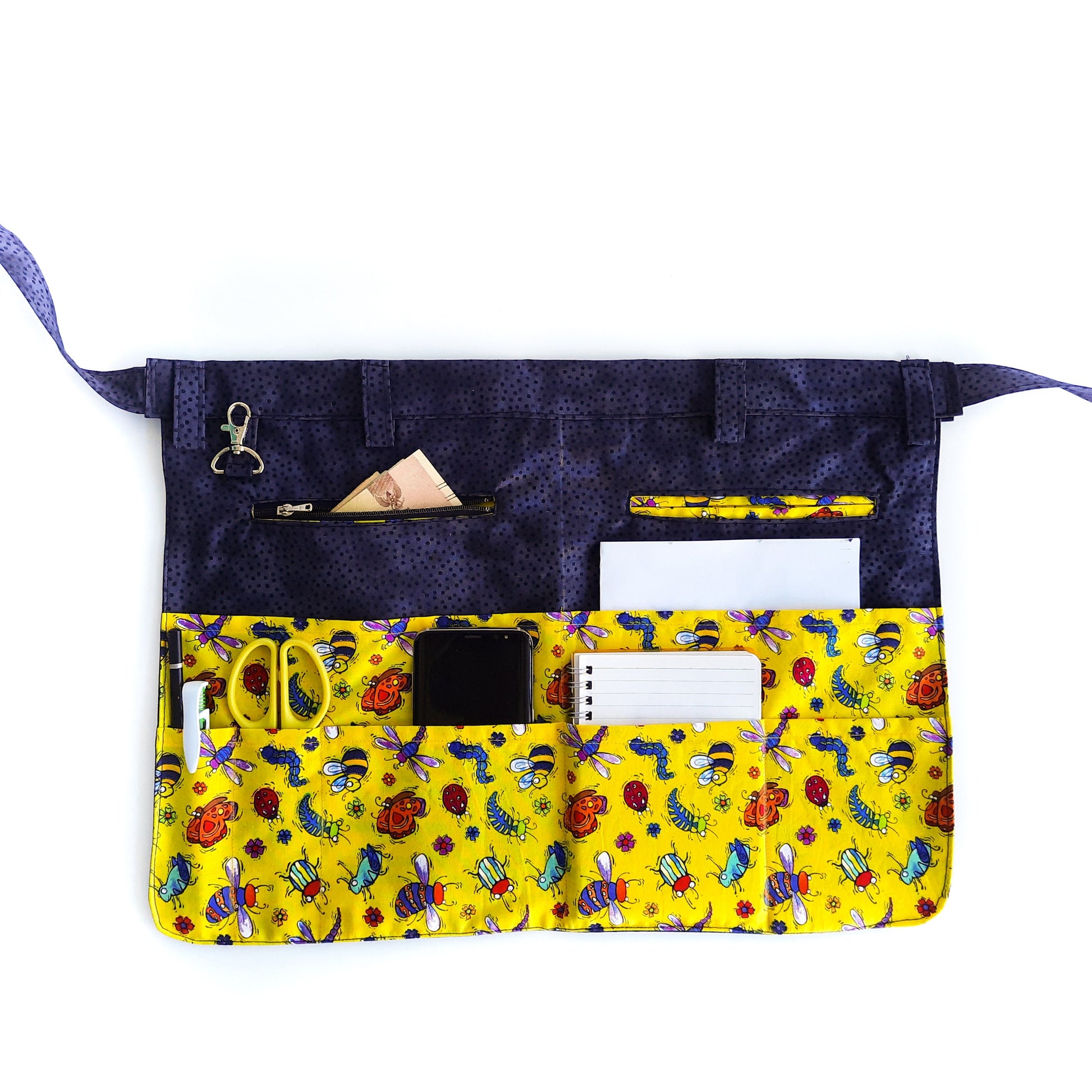 Craft apron item comes with 1 PDF pattern and 9 pages of PDF instructions. Apron has one zipper pocket and one hidden pocket, and there are several pockets depending on how you want to distribute them, I made 7 different pockets with different sizes. You will need one strap lock, one zipper15cm/6", one yard of the base fabric, and half a yard of printed fabric.