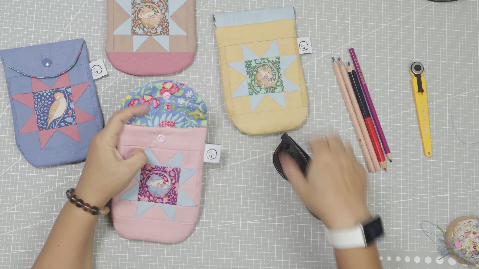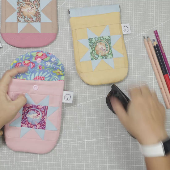This unique design features a star block front and two different styles, letting you create two variations of the same elegant pouch. Perfect for carrying small essentials like lip balm, keys, glasses, pencilcase or sewing notions — or as a sweet handmade gift!